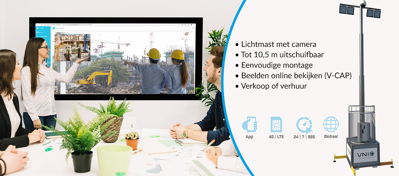 Dan is onze View And Integrate lichtmast is de ideale oplossing. Door deze uit te rusten met een mobiel camerasysteem ervaart u een nieuwe dimensie van werfopvolging en werfbewaking.